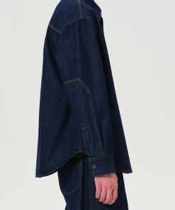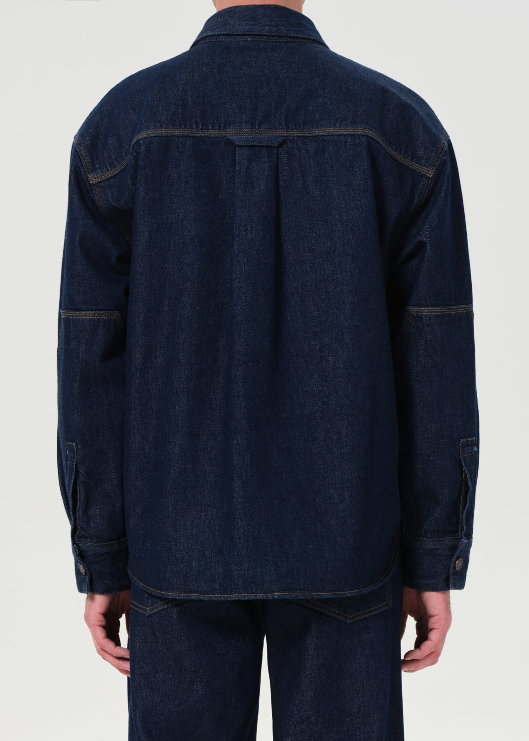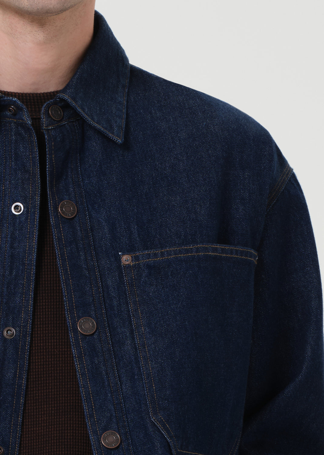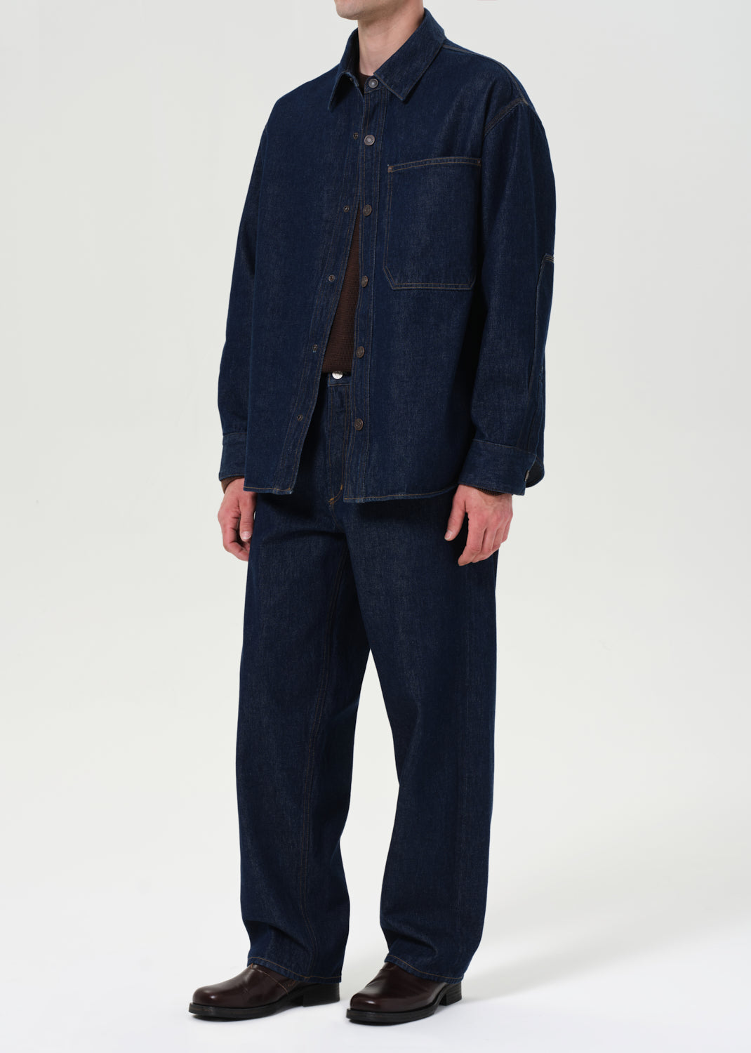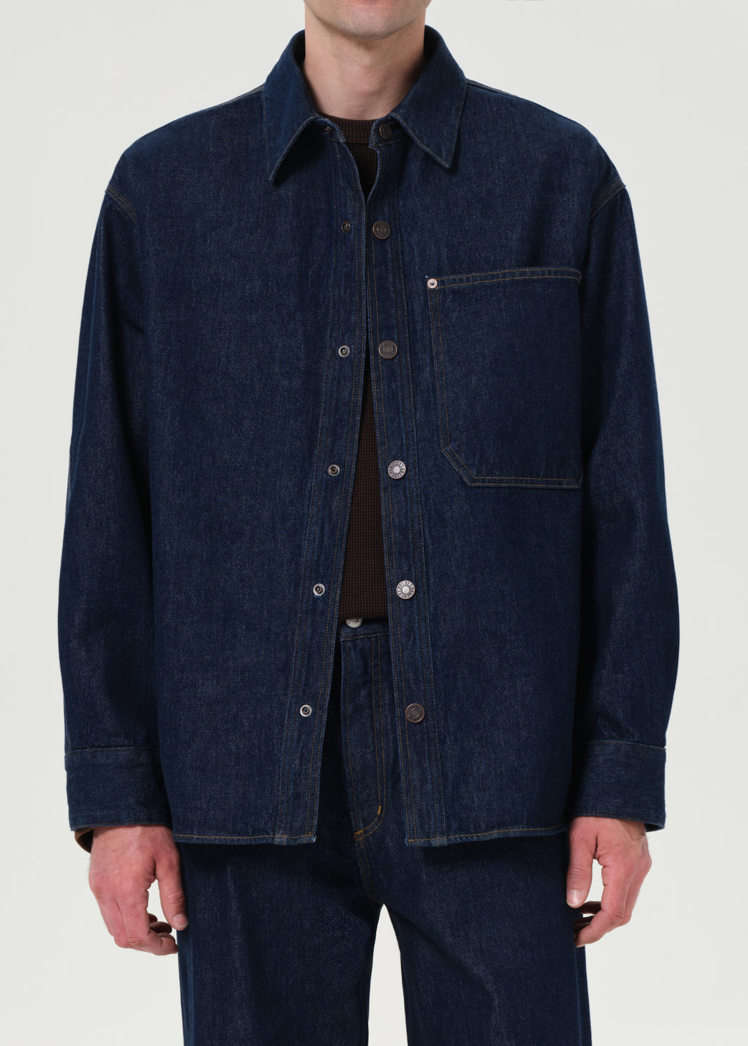A long-sleeve button-up cut from rigid, heavyweight denim in a clean dark rinse. Crafted from 100% Regenerative Cotton with a soft, wearable hand. Structured, minimal, and true to size.