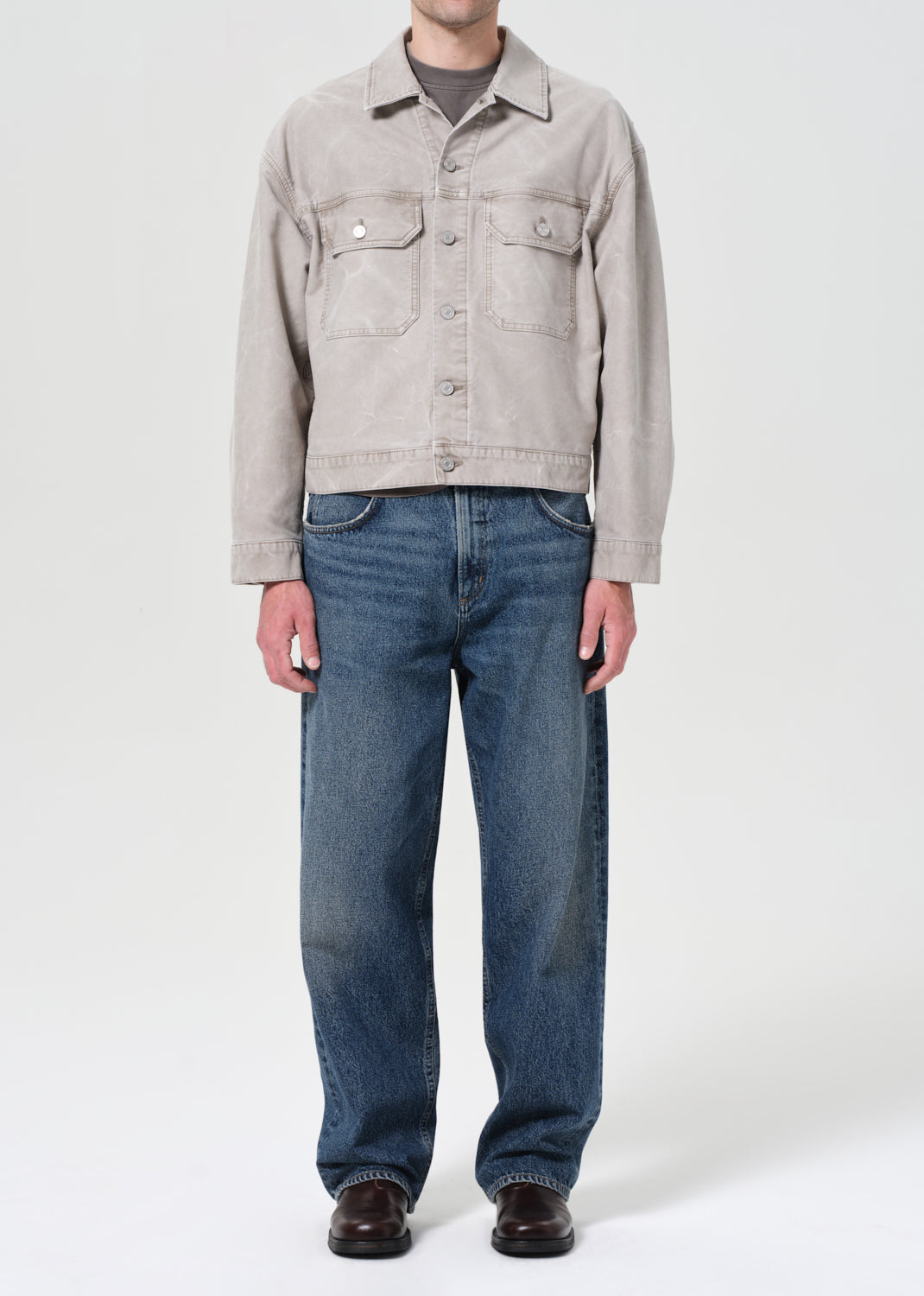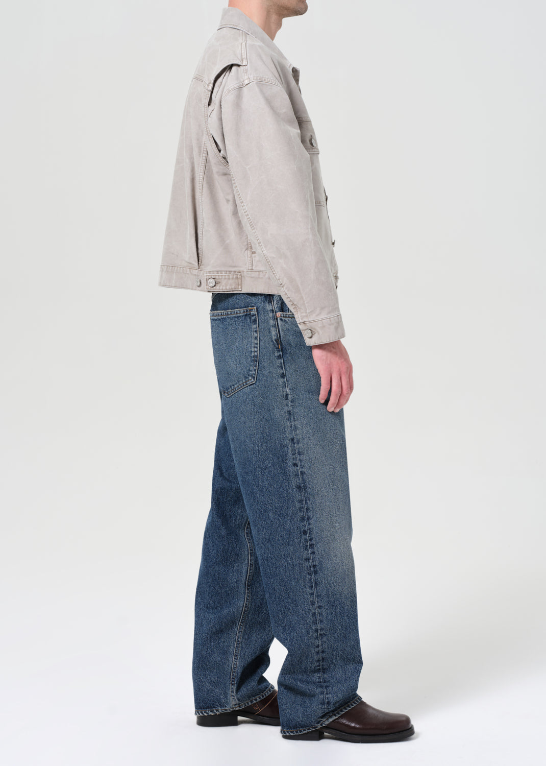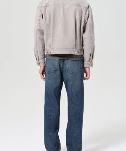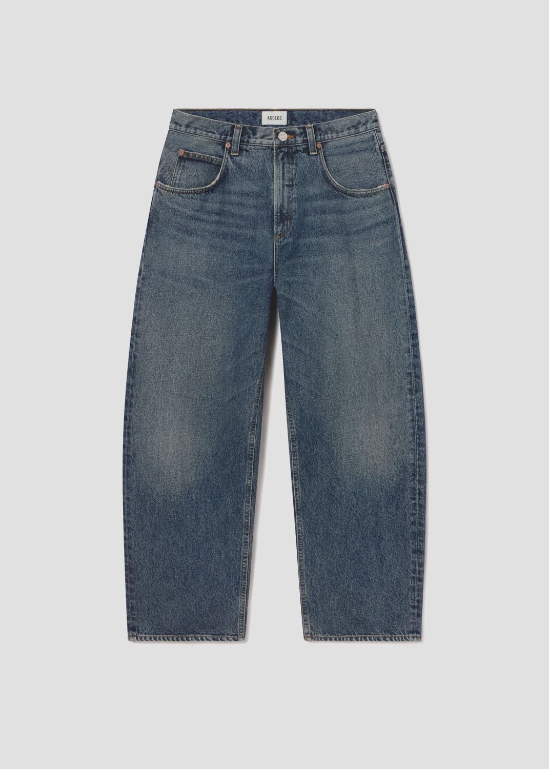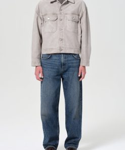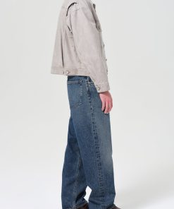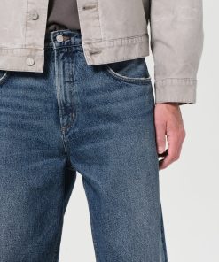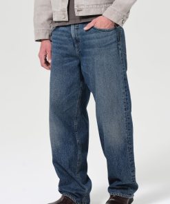 A baggy, mid-rise fit crafted from rigid, heavyweight denim in dark worn-in vintage indigo, featuring fading, marbling, and whiskering details. Made from 100% Cotton, it offers a soft hand feel for all-day wearability.