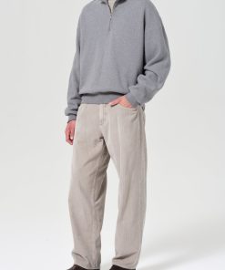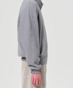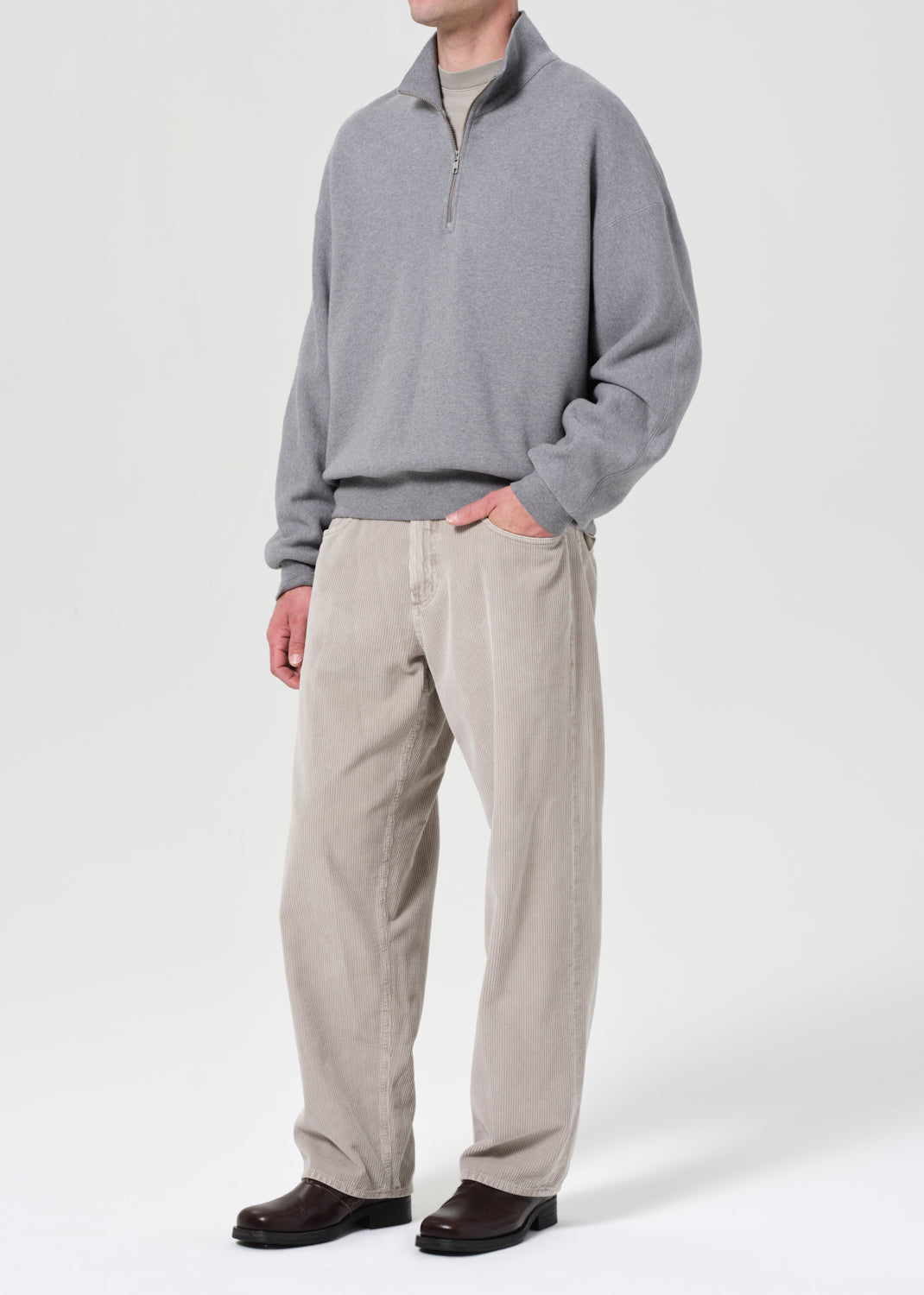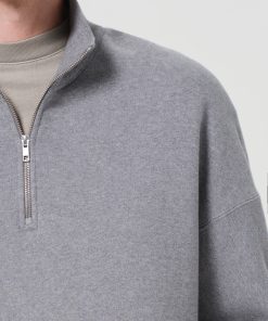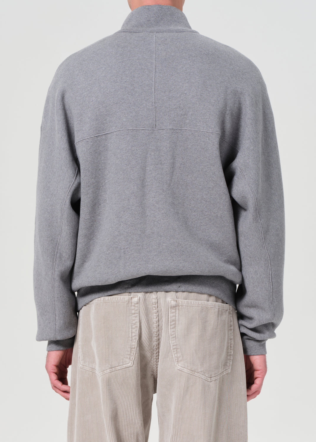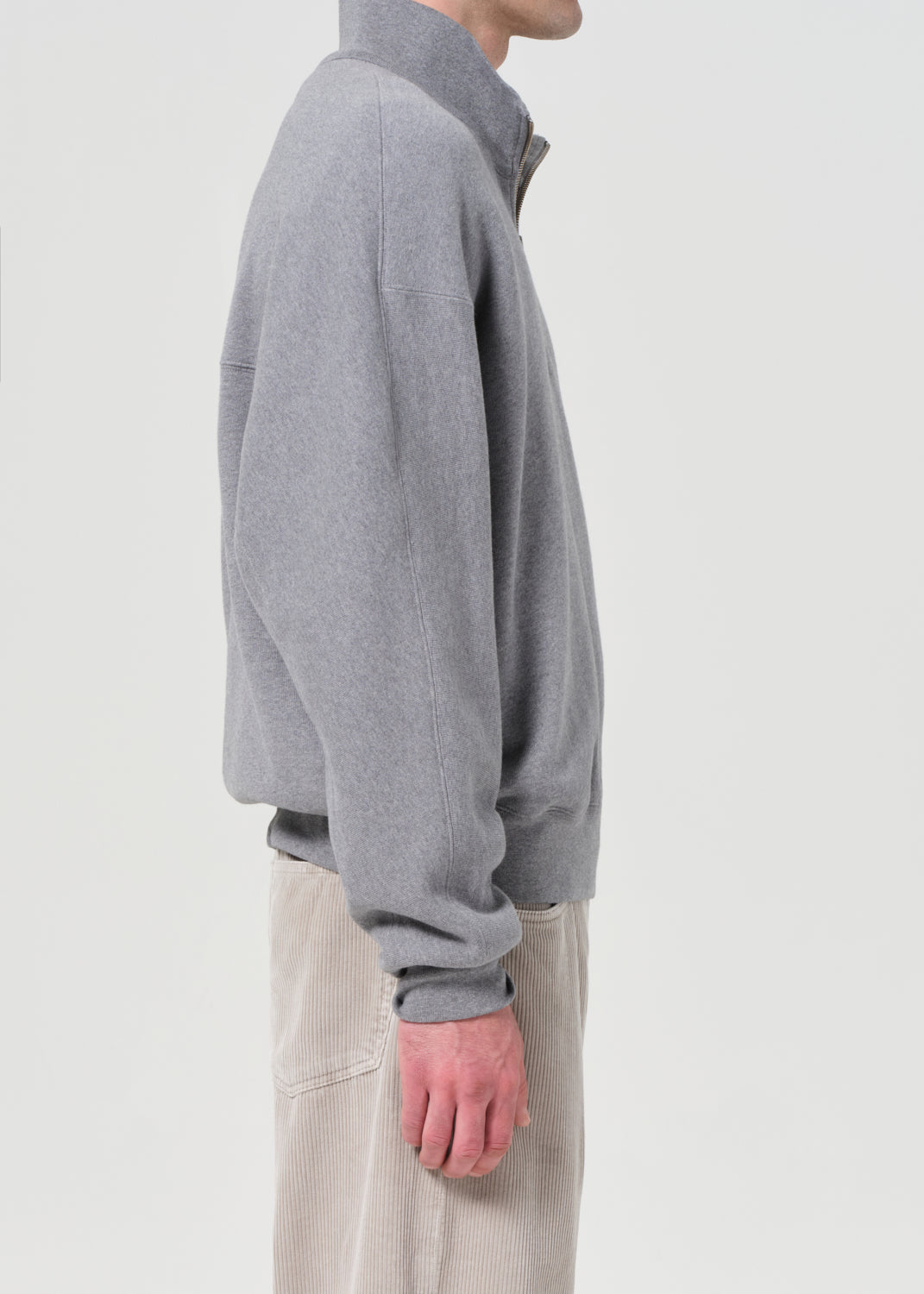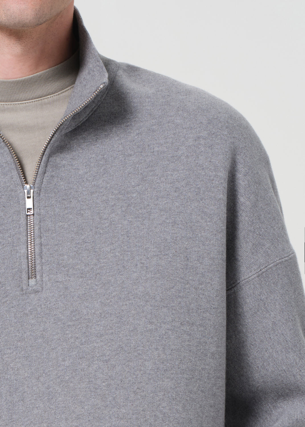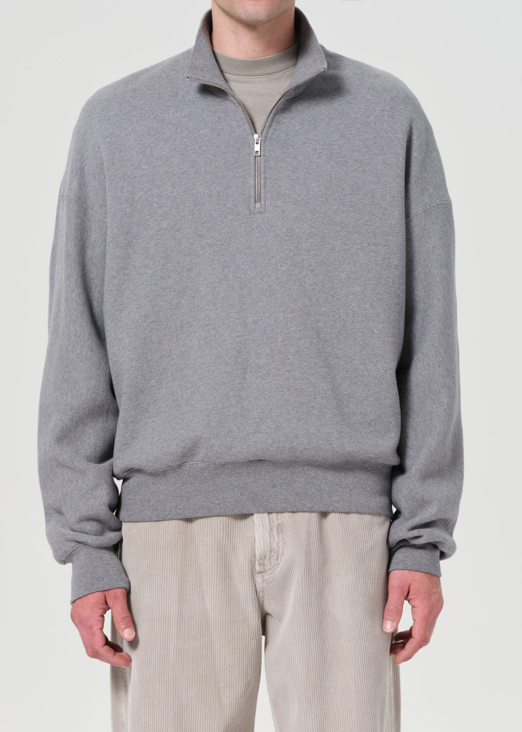 A medium grey quarter-zip long sleeve sweatshirt in heavyweight brushed fleece. True to size, ideal for layering or wearing on its own. Made from 100% Cotton.