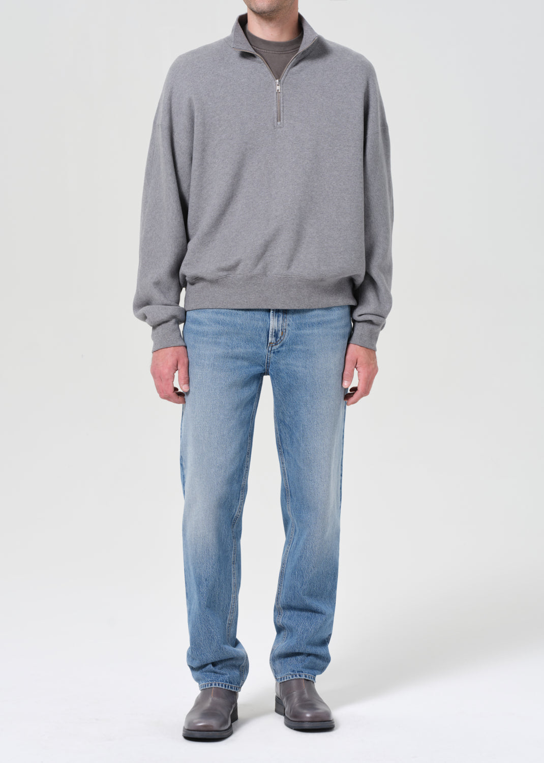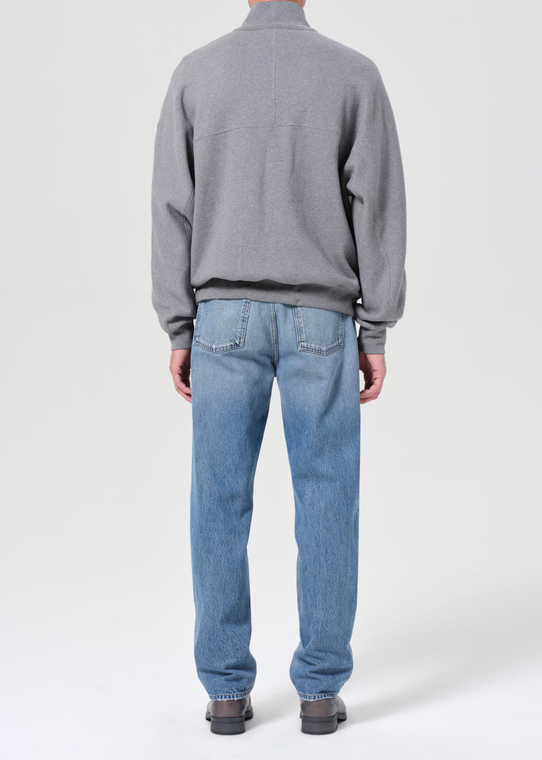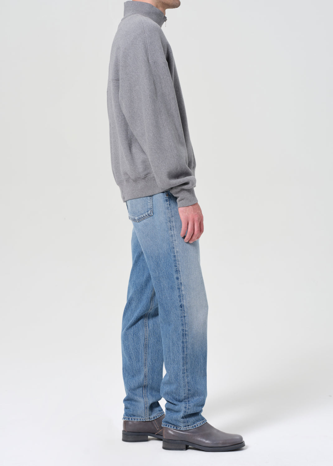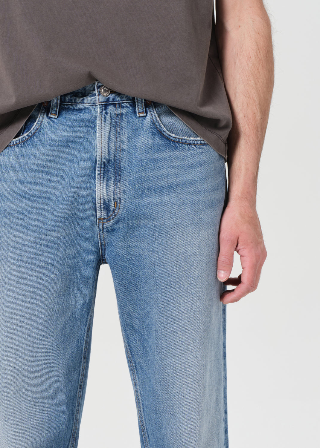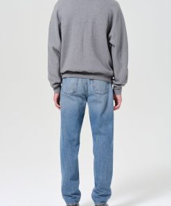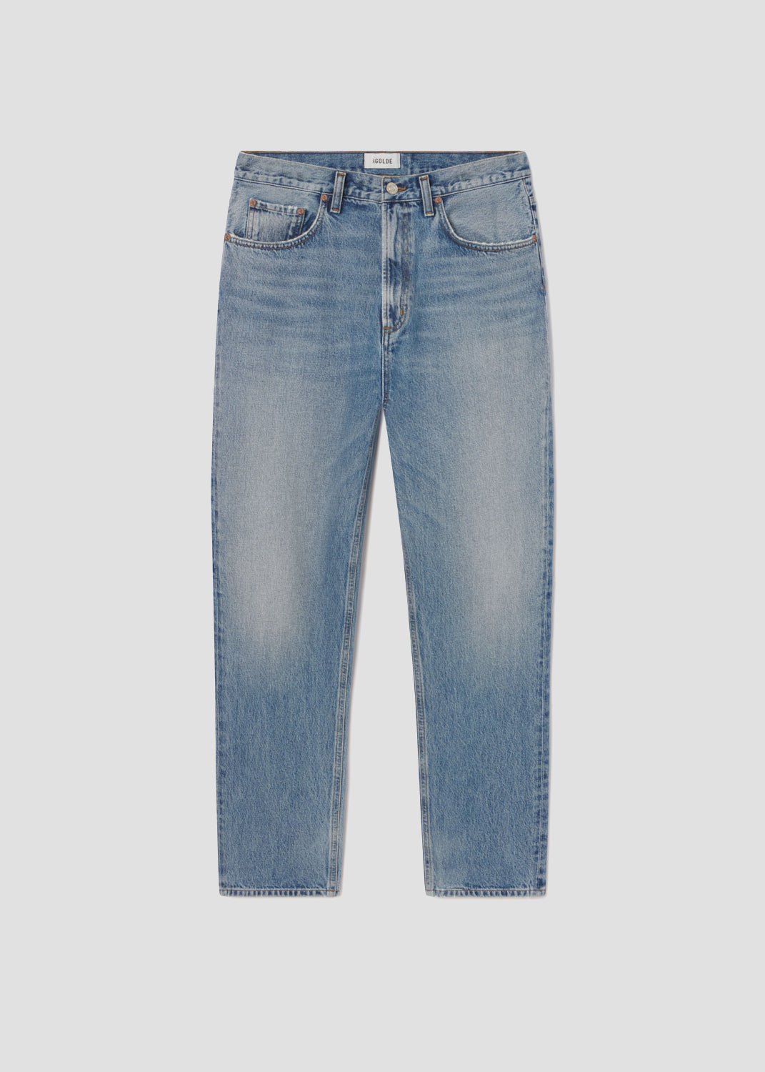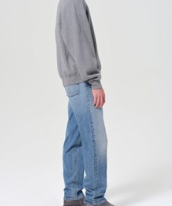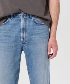 Mid-rise waist and a classic straight leg fit. Worn-in medium indigo denim with fading, marbling, and whiskering details. Made from 100% regenerative cotton.
