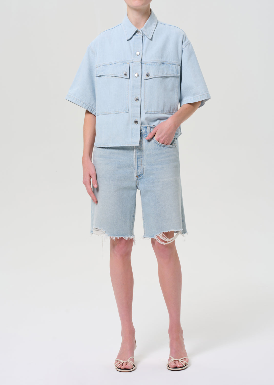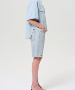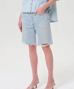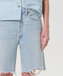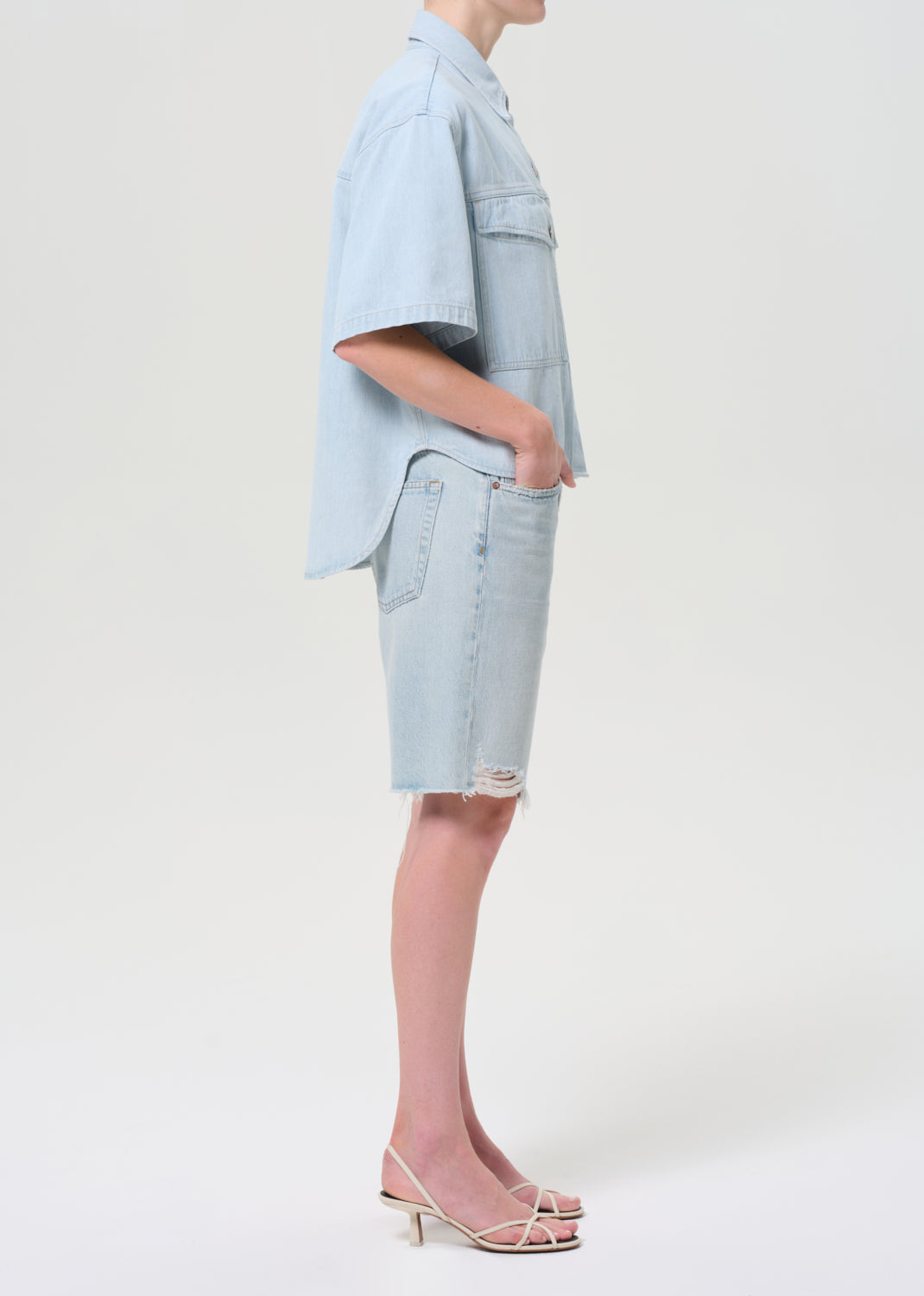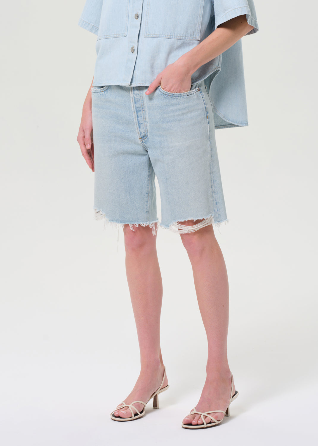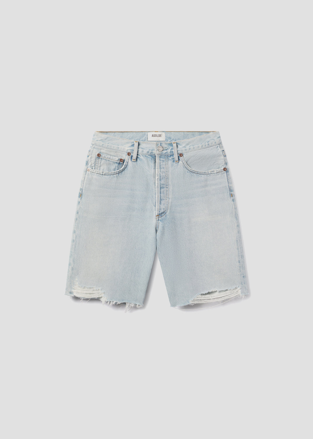 The 90’s Short sits relaxed at the waist with a roomy extended inseam that hits just above the knee. Crafted from regenerative cotton and lightweight vintage pale indigo denim from the AGOLDE Weightless collection, it offers an ultra-light, breathable feel. Featuring subtle fading, whiskering, and a raw hem, it’s the perfect warm-weather essential. Style with a white tank and chunky sandals for a casual vibe, or pair with an oversized button-down and slides for effortless chic.