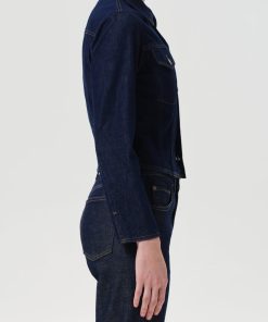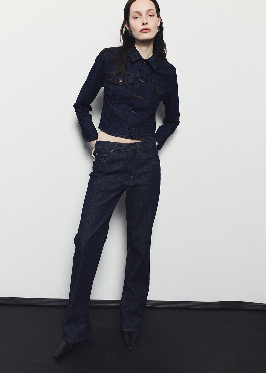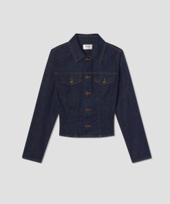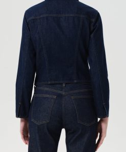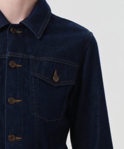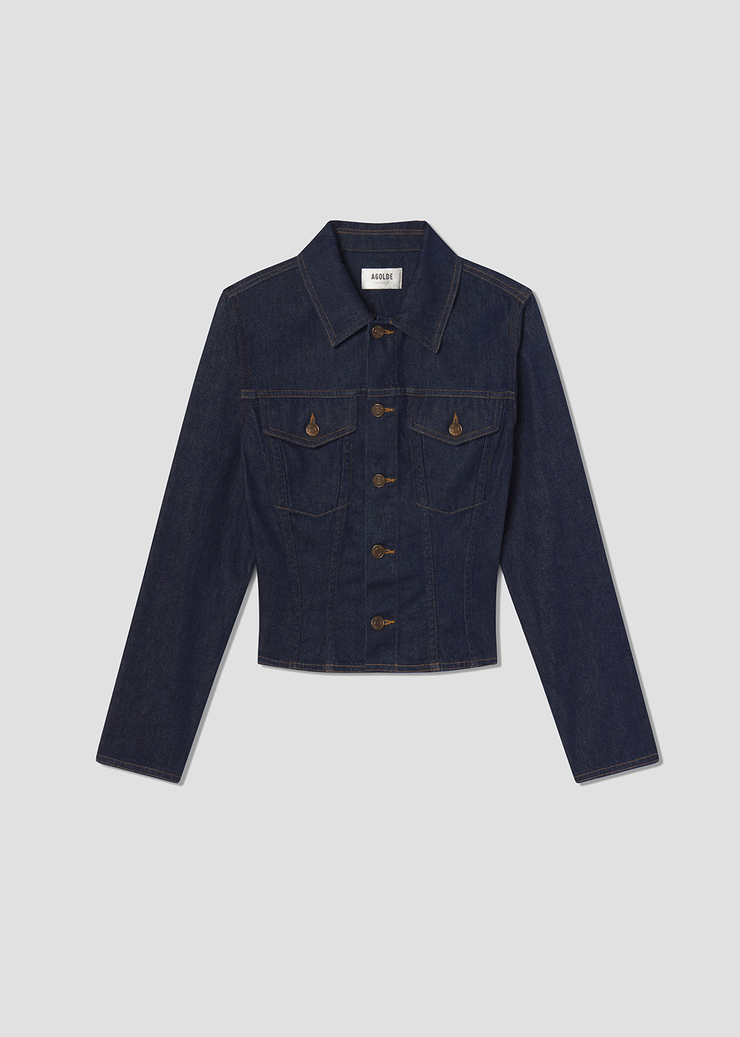 Looks Like: Dark deep rinsed indigo fitted denim jacket