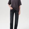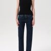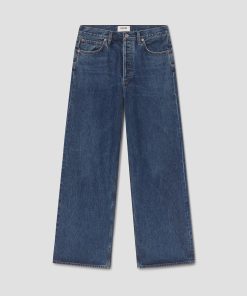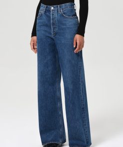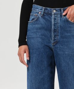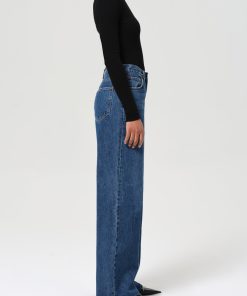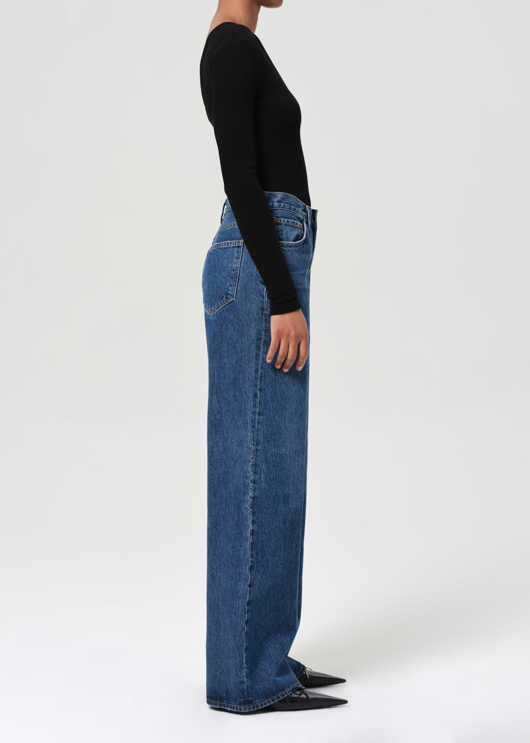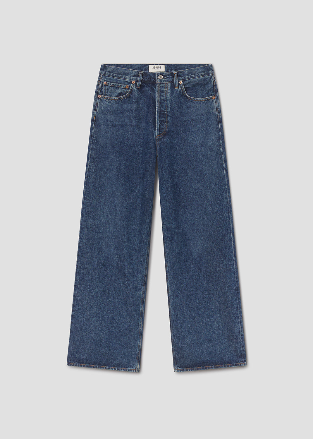 The Dame Jean features a flattering high rise and a wide leg with a clean, no-cuff finish. Crafted from rigid, non-stretch regenerative cotton denim with a soft hand, this dark vintage indigo wash is subtly marbled for a time-worn effect. Pair with a tucked-in tee or slim tank for an easy, elongated silhouette. Now available in a 29.5″ inseam.