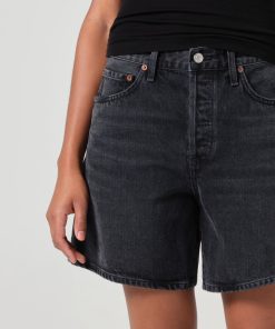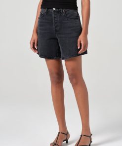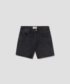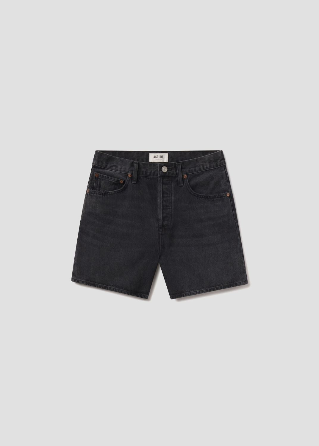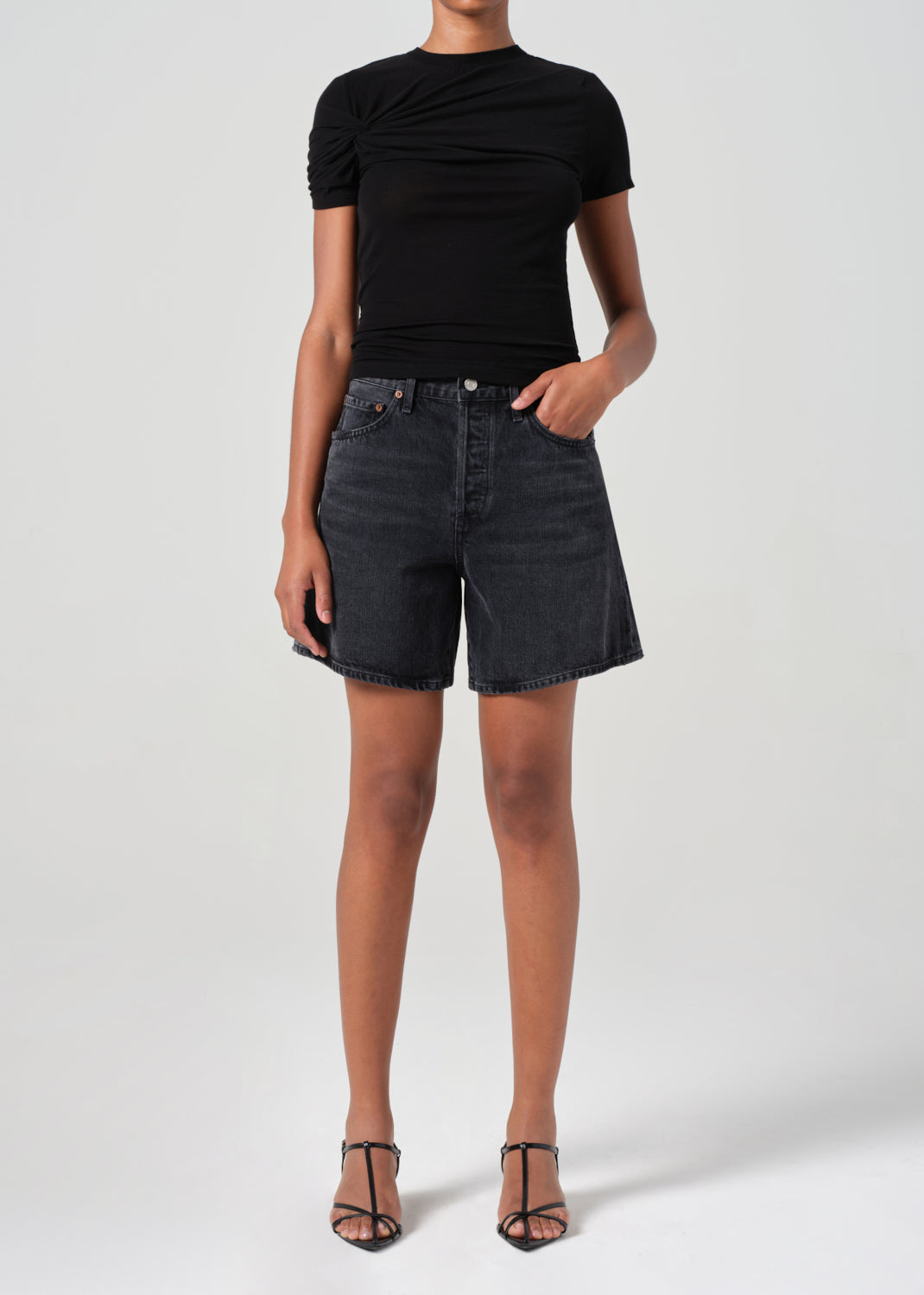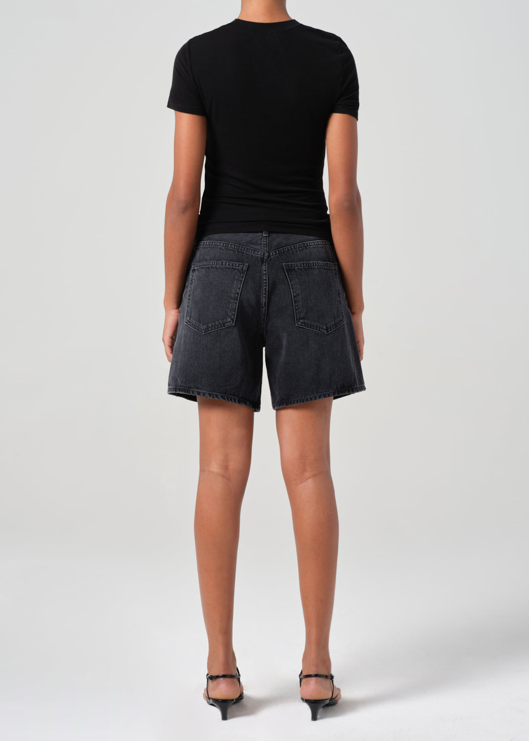 The Dame Short is crafted from washed black denim with subtle whiskering, giving it a worn-in, vintage feel. Featuring a high-rise fit, relaxed silhouette, and wide leg opening, these shorts offer a perfect balance of comfort and style. The clean hem adds a polished touch, making them ideal for pairing with a simple tank or oversized shirt for an effortlessly cool, warm-weather look.