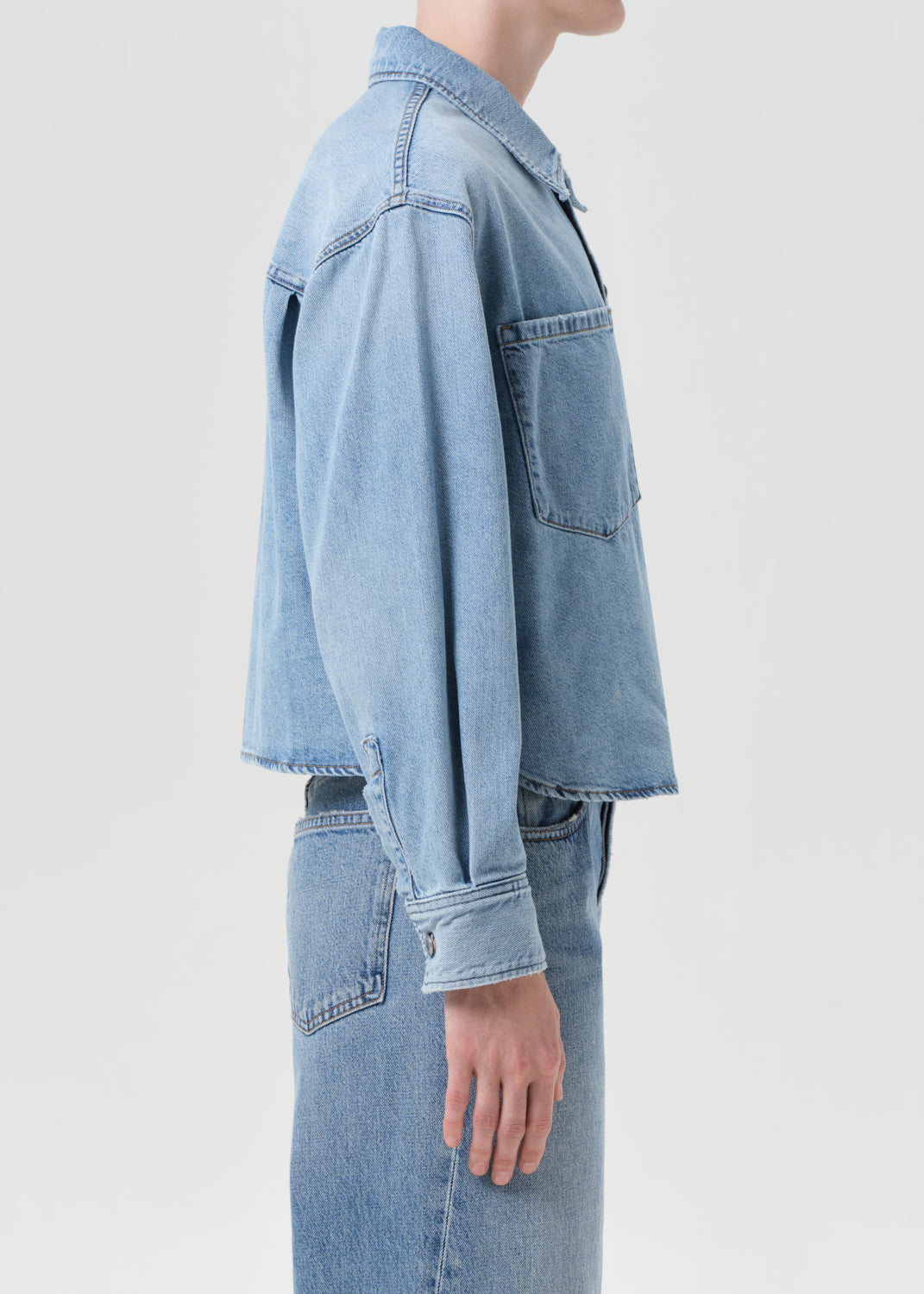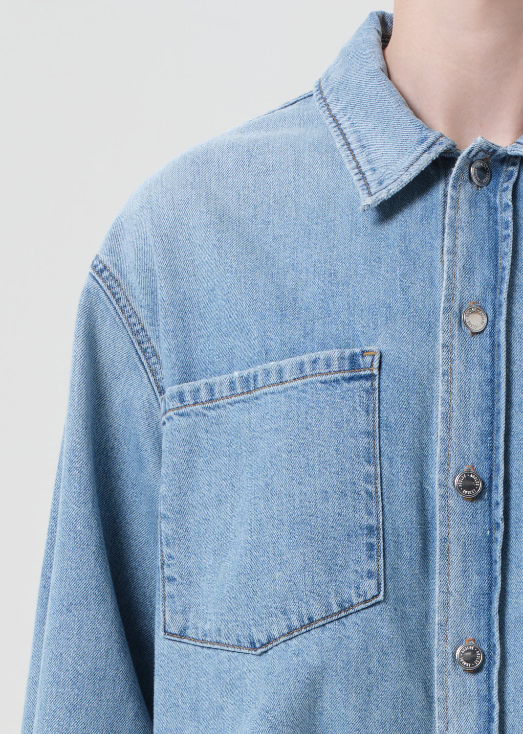 The Juna Shirt is a relaxed button-up with dropped shoulders and front patch pockets for a utilitarian feel. Crafted from non-stretch, weightless denim in a bright, washed indigo, it’s soft, breathable, and designed for effortless layering. Style it open over a tank or buttoned-up with tonal jeans for a head-to-toe denim look.