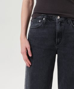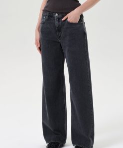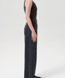 The Keira Jean is a low-rise, baggy silhouette with a relaxed full-length leg and structured hip. In Symbolic, it’s offered in a medium washed-out black with soft marbling and whiskering for a broken-in look. Pair with a sleek tank or slouchy knit to play with proportion.