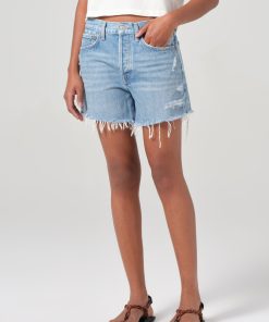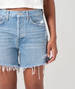Looks Like: Bright indigo denim short with fading, whiskering, marbling and distressing