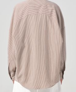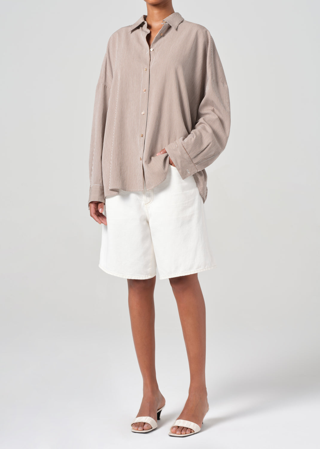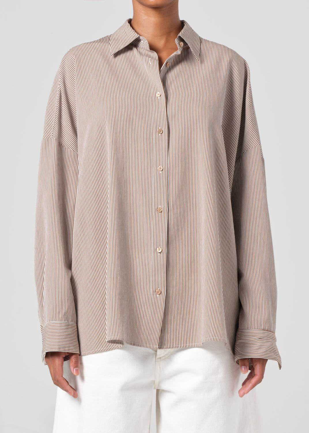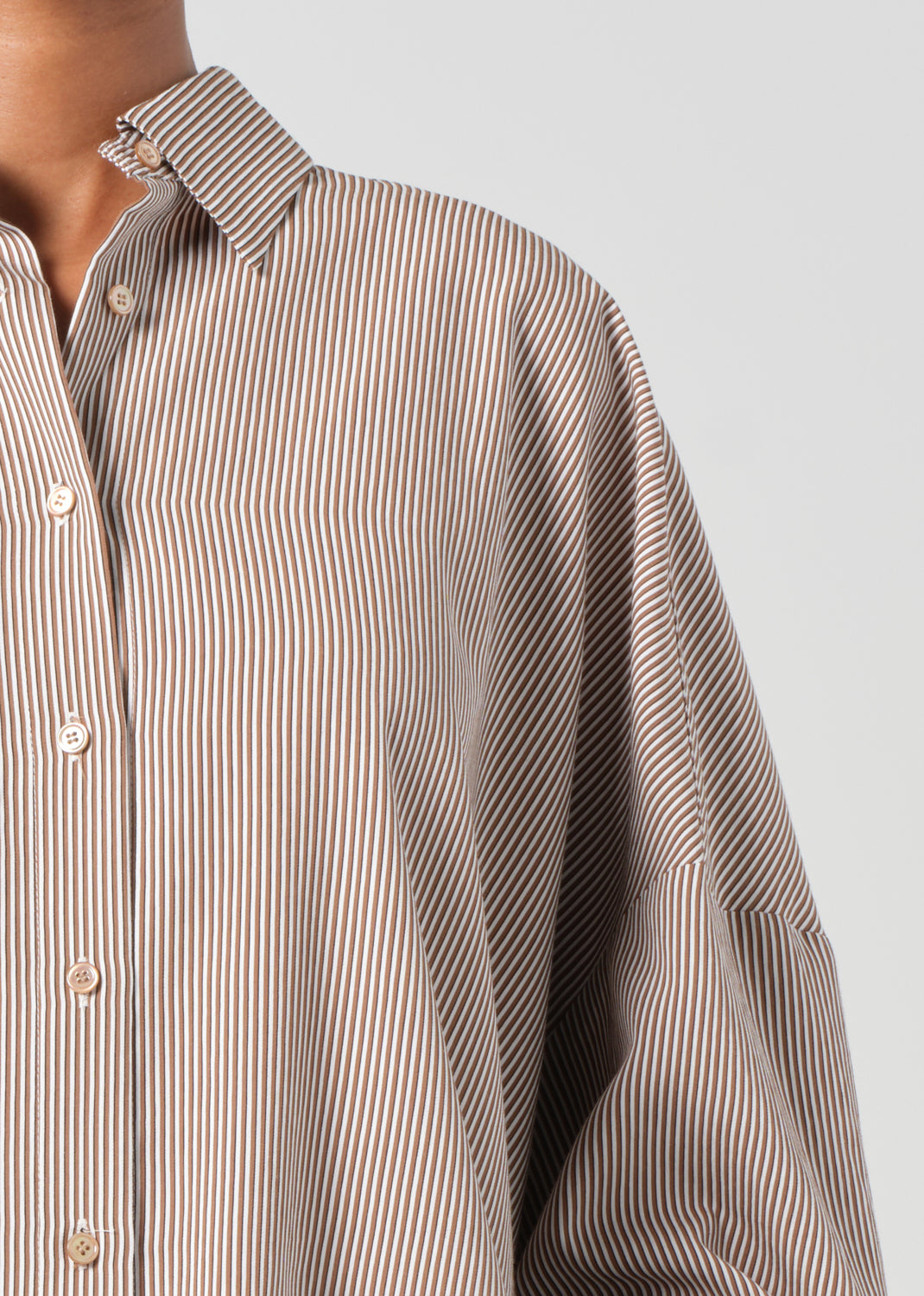 Looks Like: Brown and white micro stripe long sleeve button up shirt with balloon sleeve