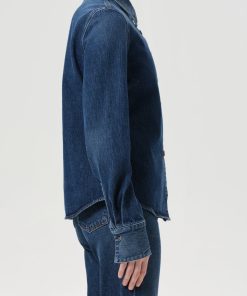 Looks Like: Dark to medium indigo denim shirt with button front closure and curved hem